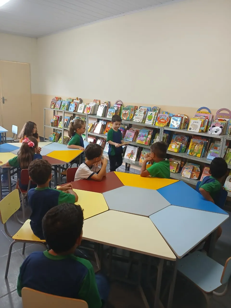 Na Pré-Escola, a turma do Pré II Regular viveu uma experiência de leitura na biblioteca, guiada pela professora Thalita, onde cada aluno escolheu sua própria aventura.