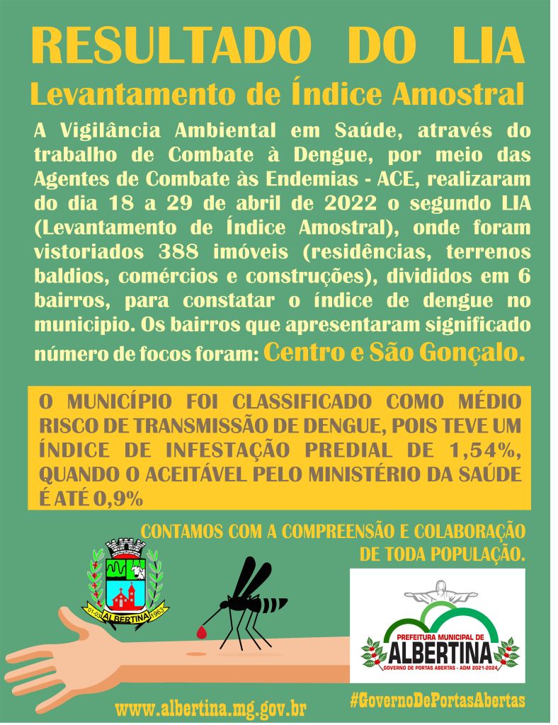 A Vigilância Ambiental em Saúde, através do trabalho de Combate à Dengue, por meio das Agentes de Combate às Endemias - ACE, realizaram do dia 18 a 29 de abril de 2022 o segundo LIA (Levantamento de Índice Amostral), onde foram vistoriados 388 imóveis (residências, terrenos baldios, comércios e construções), divididos em 6 bairros, para constatar o índice de dengue no municipio. Os bairros que apresentaram significado número de focos foram: Centro e São Goncalo.