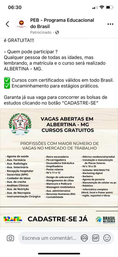 A Prefeitura Municipal de Albertina alerta a população sobre um anúncio falso que vem sendo patrocinado nas redes sociais, promovido pela página “PEB – Programa Educacional do Brasil”. A propaganda promete cursos gratuitos com matrícula realizada em Albertina, oferecendo certificados, vagas de estágio e formação em diversas áreas profissionais.